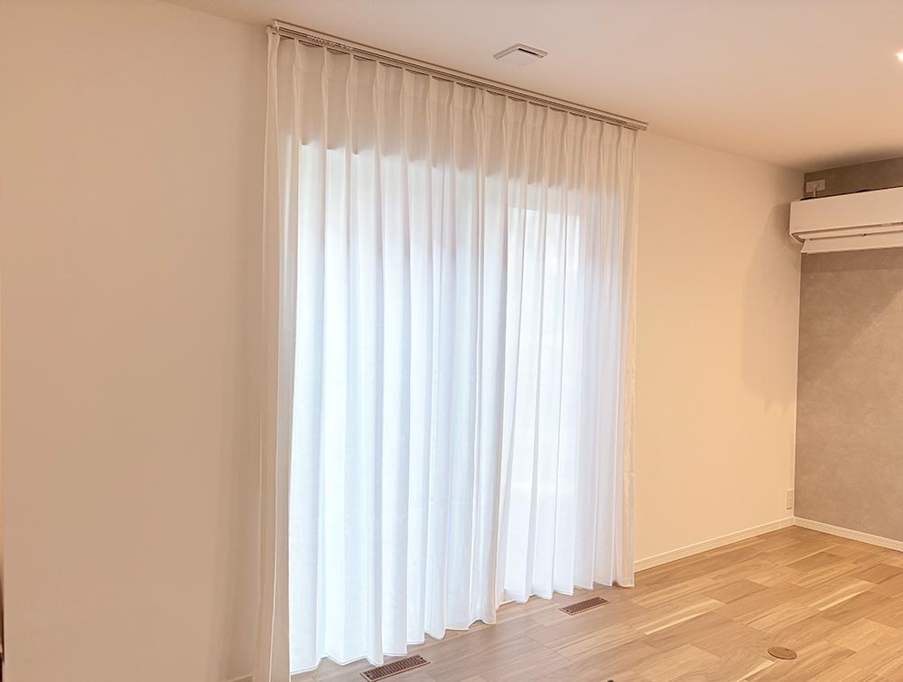 縦型ブラインドと悩んでいましたが、部屋の雰囲気的にナチュラルなカーテンの方が合うかなと思い、レースカーテン1枚で部屋が明るく見える事と夜外からの視線が気にならない物を探していました。