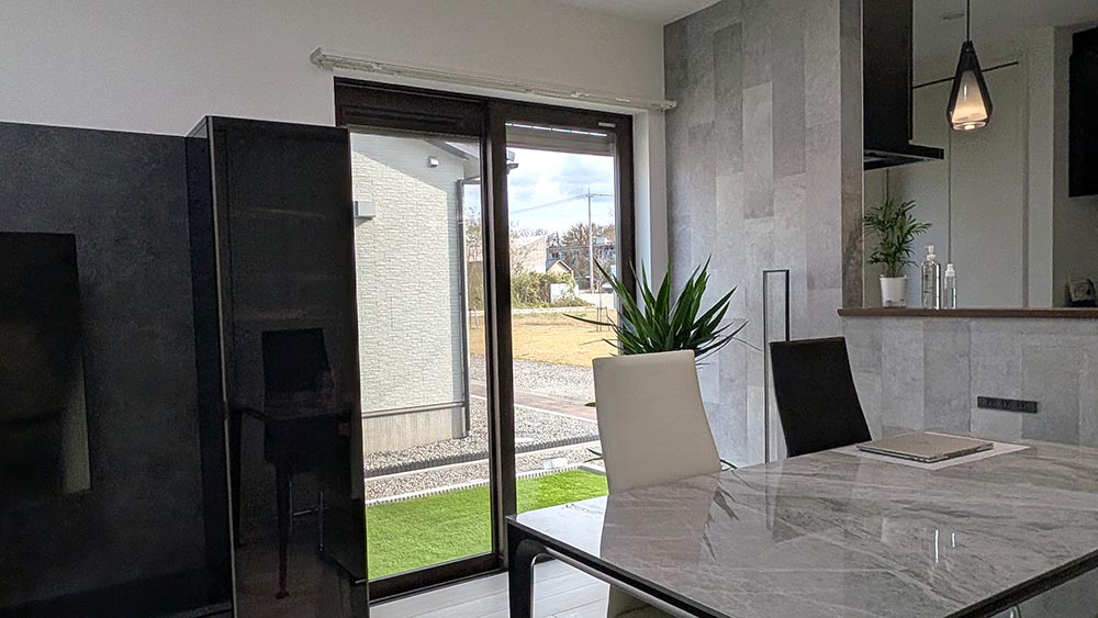 黒やグレーなどダーク系のインテリアが多い部屋に「ネフライトカーテン」を付けると、窓の枠を隠し優しい光が広がるので、何もつけていない時よりも明るい印象になりました。