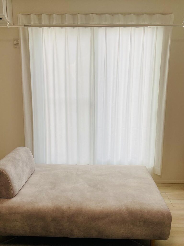 真っ白なカーテンですが、光の加減でほんのり黄色く見えるのでちょっと残念。