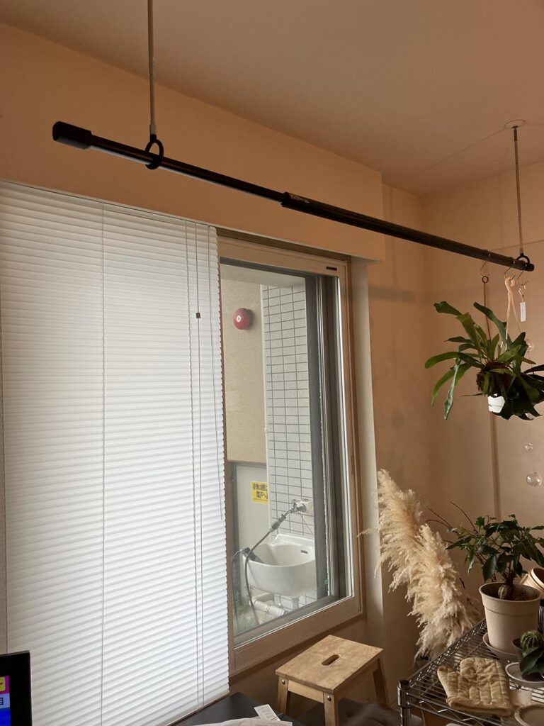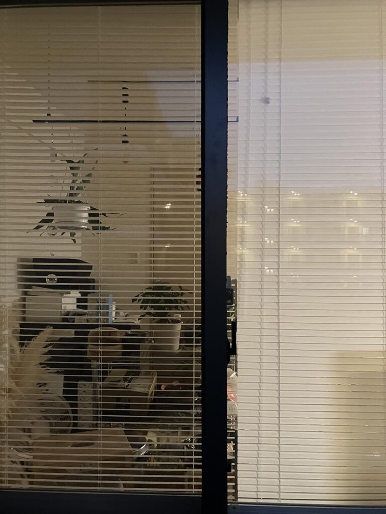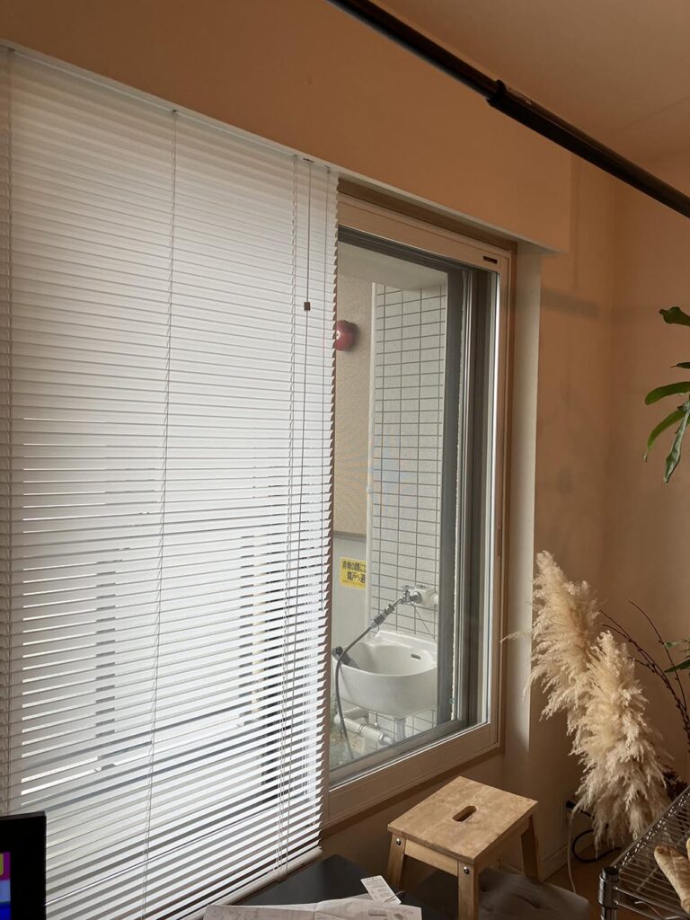 目視できる距離の視線や、外の建物の圧迫感は感じくくなりました。冬場昼間の明るさをとりいれて壁が明るくなりました。夜は窓ギリギリの観葉植物以外はうつりません。