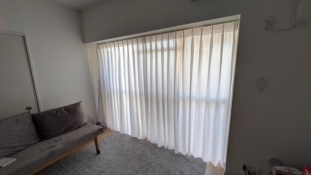 白のレースカーテンで爽やかな見た目になることに加え、部屋がとても明るくなりました。