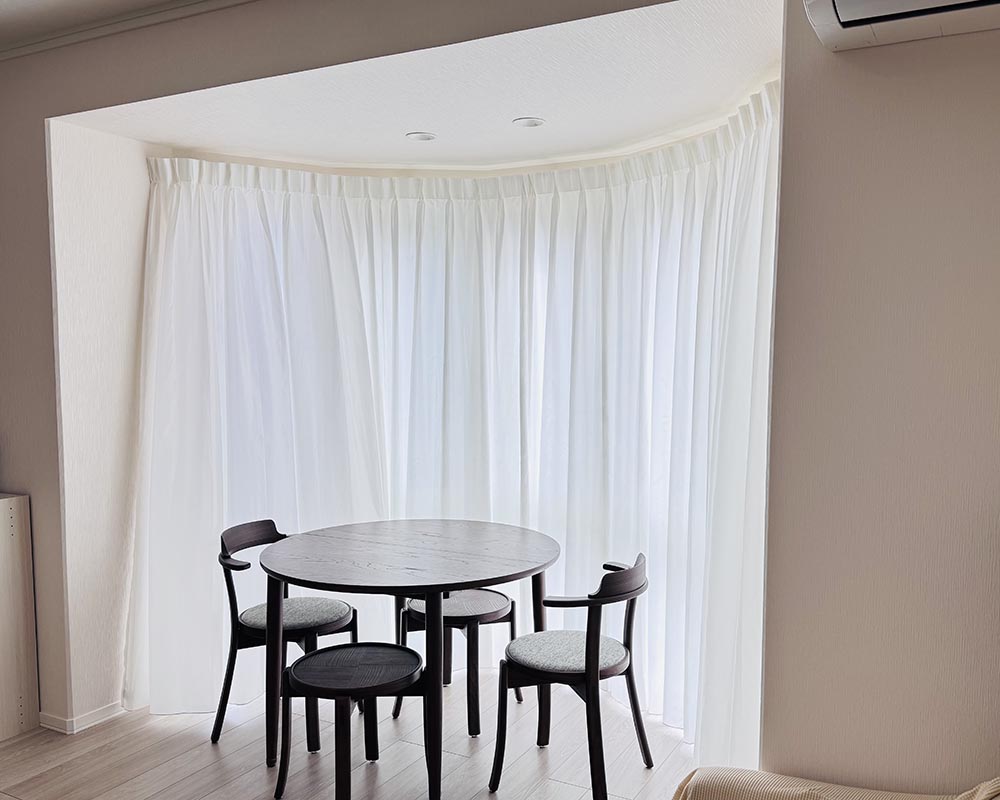 明るいリビングにしたかったのと、ドレープカーテンが左右にもたつく感じをさけたかったのですが、夜に外からも見えないもので、ネフライトがぴったりでした。