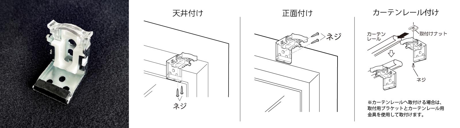 アカリナ for home ヨコ型用のブラケット。正面付け・天井付け・カーテンレールへ取付け、全てこのブラケットで取付けが可能です。ブラインドをご購入時に製品と一緒に同梱されている部品になります。