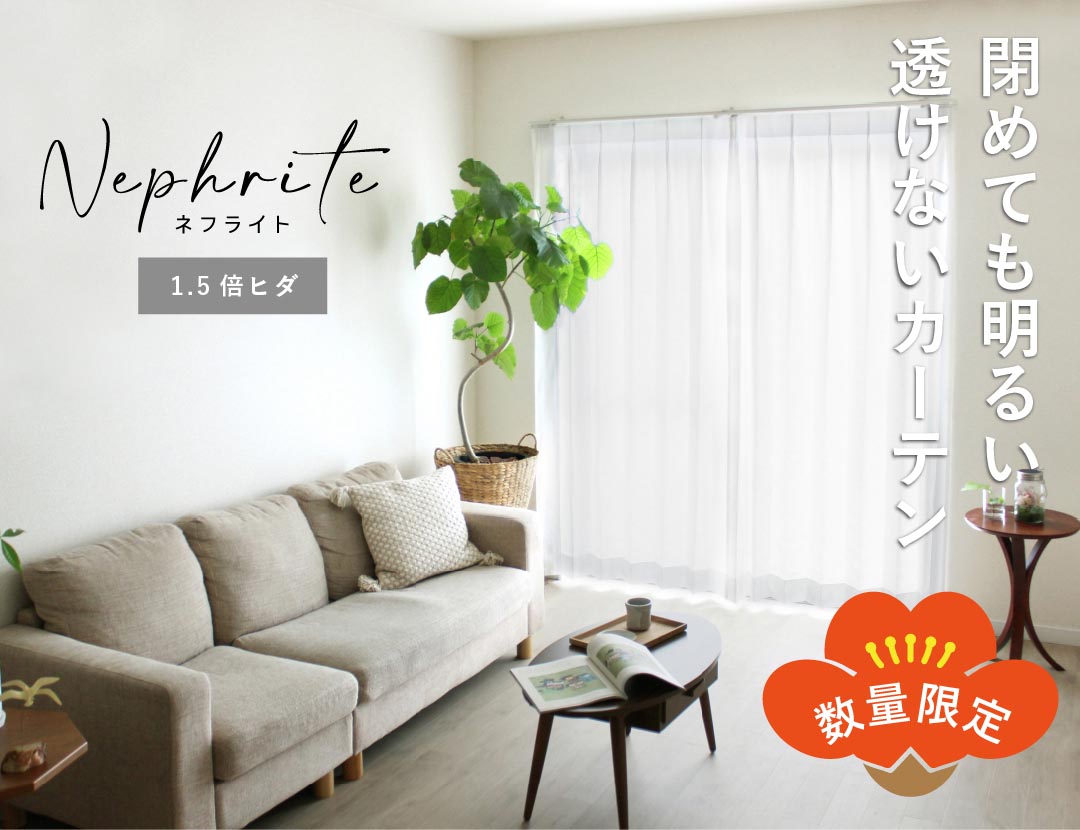 すっきり美しい白色と上質で軽やかな生地が特徴の、 採光カーテン ネフライト。 日中の光がある明るい時間帯も、夕方から夜にかけての薄暗い時間帯も、外から透けないネフライトは1枚で安心して暮らしていただけます。
