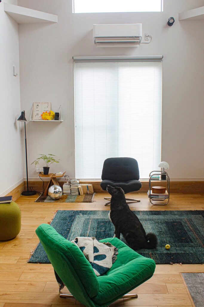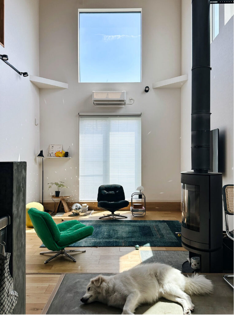 2匹のワンちゃんは、コロンと寝転んで気持ちよさそうに日向ぼっこ。その寝顔から、リビング全体に漂う穏やかで、ゆっくりした時間の心地よさが伝わってきます。
