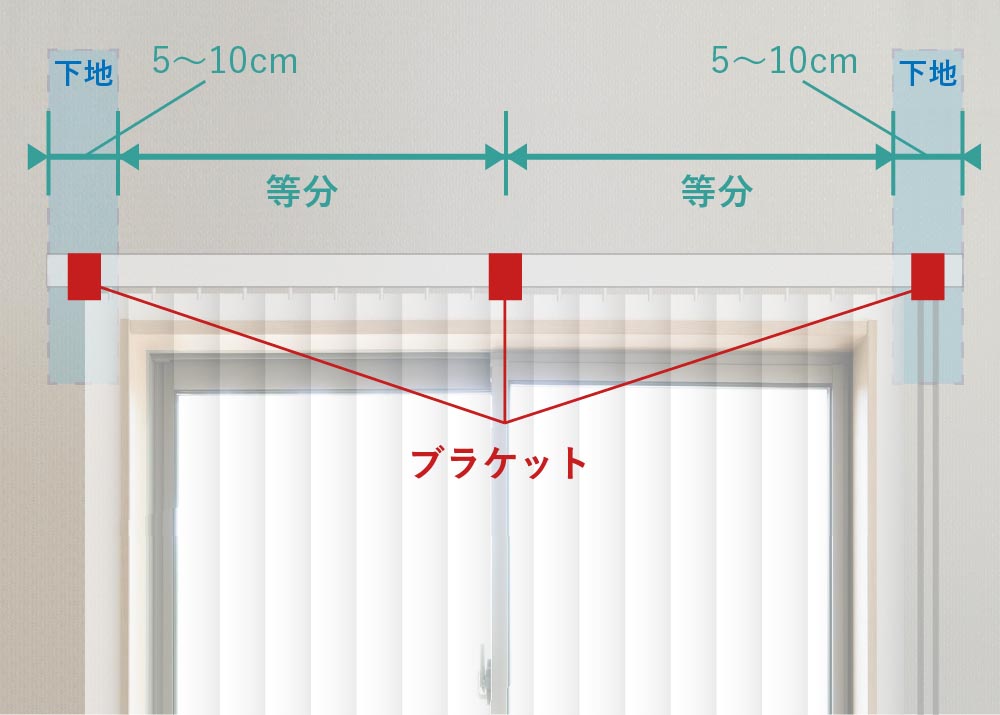 両端のブラケットは必ずレールの5~10cm内側に設置します。ブラインドを窓よりも大きくした場合、ブラケット取付位置と下地位置の確認をしてください。