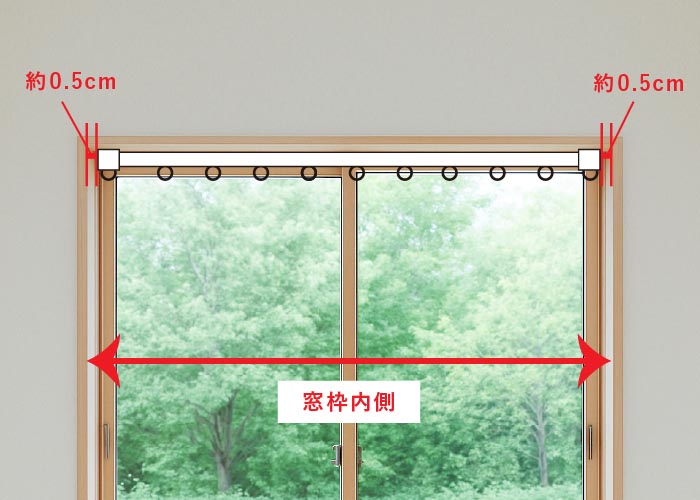 窓枠の上部やカーテンボックスの中にカーテンレールを取付ける場合「窓枠内寸−1㎝」がカーテンレールの長さになります。