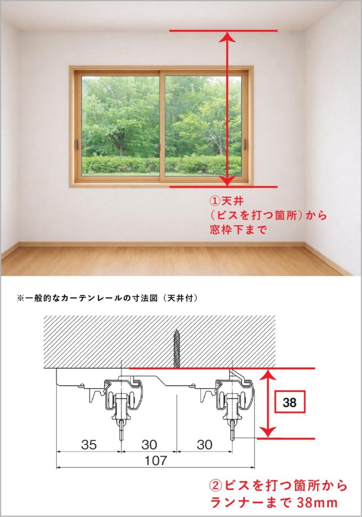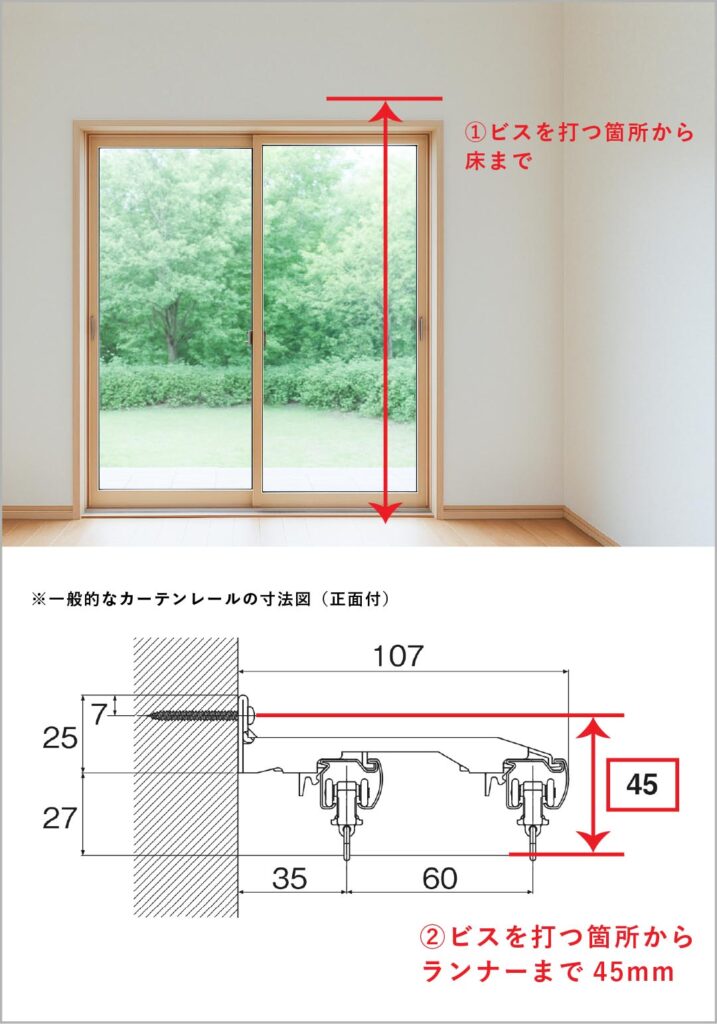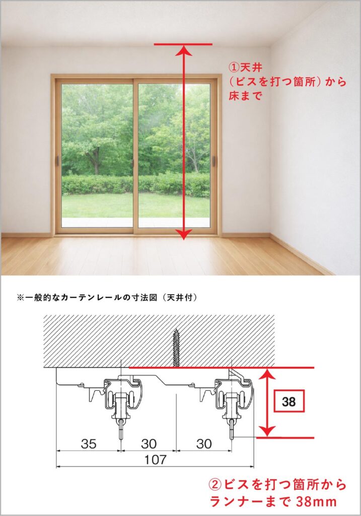ビスを打つ箇所から床までの寸法と、カーテンレールの種類が分かれば下記のように高さを出すことができます。取付予定のカーテンレールの詳細をご覧いただき、『製品寸法図』をご確認ください。