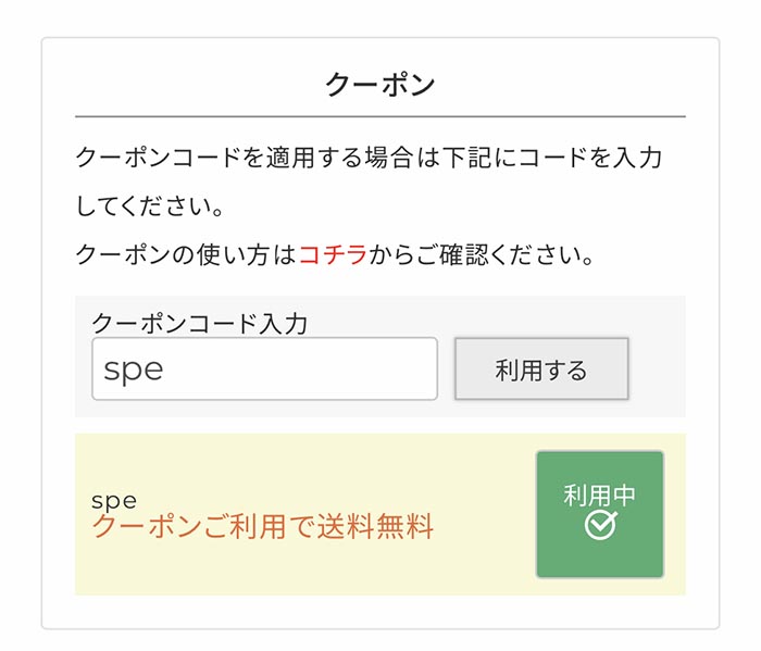 クーポンコードを入力すると、下部に該当するクーポンが表示&利用中になります。